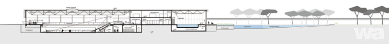 The public swimming stadium in Cologne has now been transerred to “Cologne Baths Ltd“ to realise an ”Ice Skating, Games and Natural Lake Theme Park“. A multifunctional building complex with open-air facilities for multiple use shall be designed. A welcoming entrance hall shall represent the functional centre with the gastronomy as meeting point and important economical factor. The ice stadium with 1.800 sqm is the most significant part of the complex with an additional upper ice skating track. There will be a 25 m pool and a teaching pool. The open air grounds will have a swimming and bathing pond and a sauna landscape.