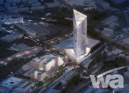 Estrel Berlin is developing a site with 3,2 ha opposite of the existing Estrel hotel with exhibition- and event halls (GFA 13-14.000 m2) as independent structures with a weatherproof connection to a multi-storey car park for 250 cars and the Estrel Tower with a building height of 176 m, 50 floors and approx. 54,000 m2 GFA. The 4-star plus hotel shall comprise apartments and offices, and public zones such as the lobby, 2 restaurants, sky bar and a spa.