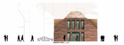 Der Neubau erhält seine Eigenständigkeit durch die Materialität und die gewählten Fassadenöffnungen. Die vorgehängte Fassade aus Ziegelplatten zieht sich über die Dachflächen bis hin zum First und fügt sich dadurch trotz der formalen Transformation behutsam in den Kontext ein – Zeitgenossenschaft und Einfügung werden zum nachvollziehbaren Thema der Architektur.