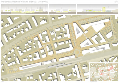 Das Gebiet des Stadtzentrums von Germering liegt unmittelbar nördlich der S-Bahn-Haltestelle Germering-Unterpfaffenhofen. Der Wettbewerbsumgriff hat eine Größe von ca. 5,1 ha, die Teilfläche für den Realisierungsteil umfasst ca. 11.800 qm.