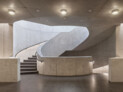 Ansonsten ist der rechteckige Baukörper sehr einfach zu beschreiben: Ihm ist im Zentrum des Erdgeschosses ein Saal eingeschrieben, über dem sich wiederum ein Innenhof befindet. Der ringförmige Grundriss reduziert die notwendige Anzahl vertikaler Erschließungsflächen und erlaubt die flexible Einteilung der Stockwerke in unterschiedliche Nutzungseinheiten. Einzig der Körper der elliptisch geschwungenen Haupttreppe kontrastiert mit der orthogonalen Gebäudestruktur.